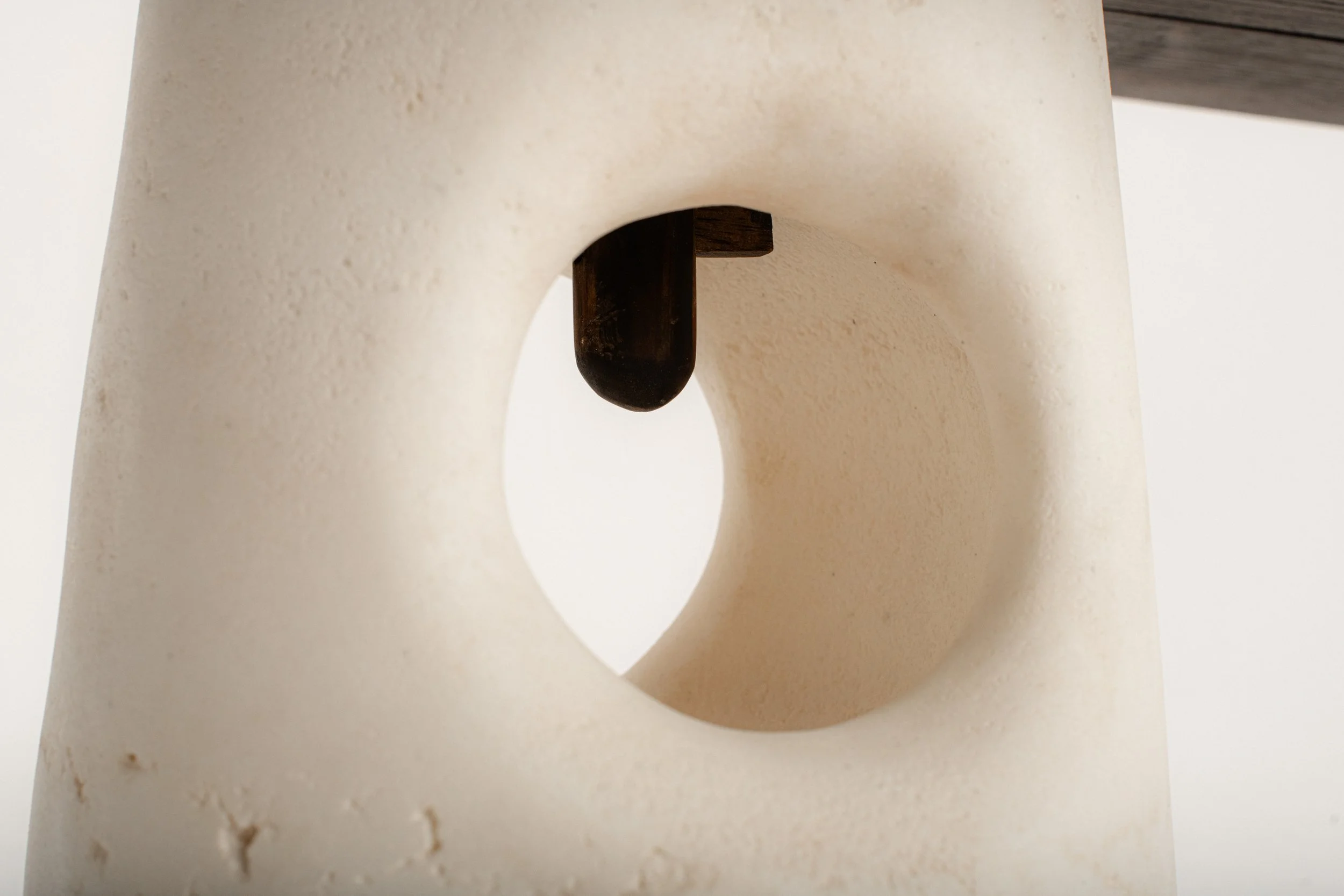 A burned wedged round tenon creates the joint between the wood and the salt.