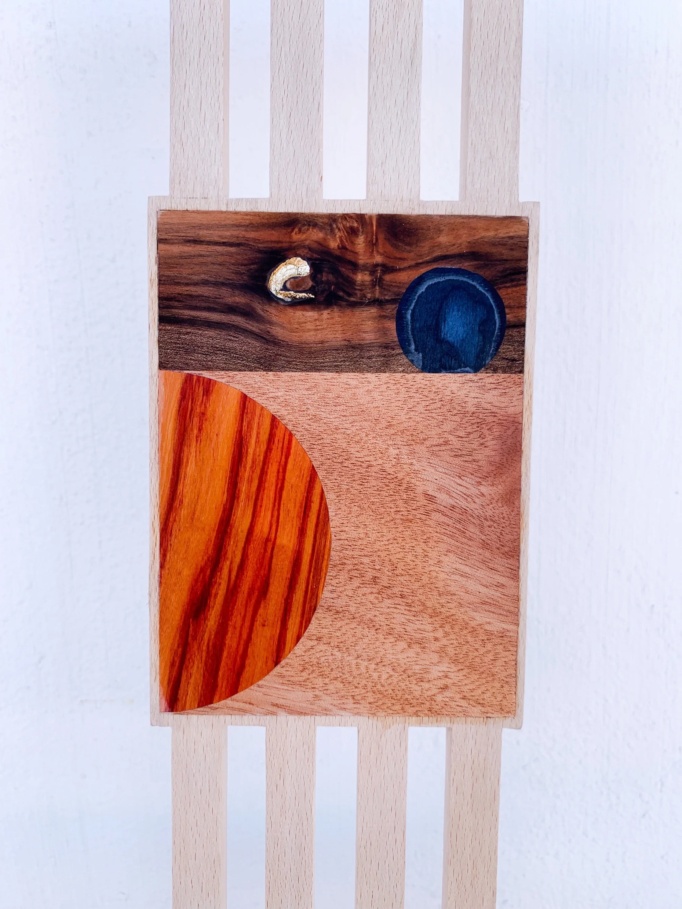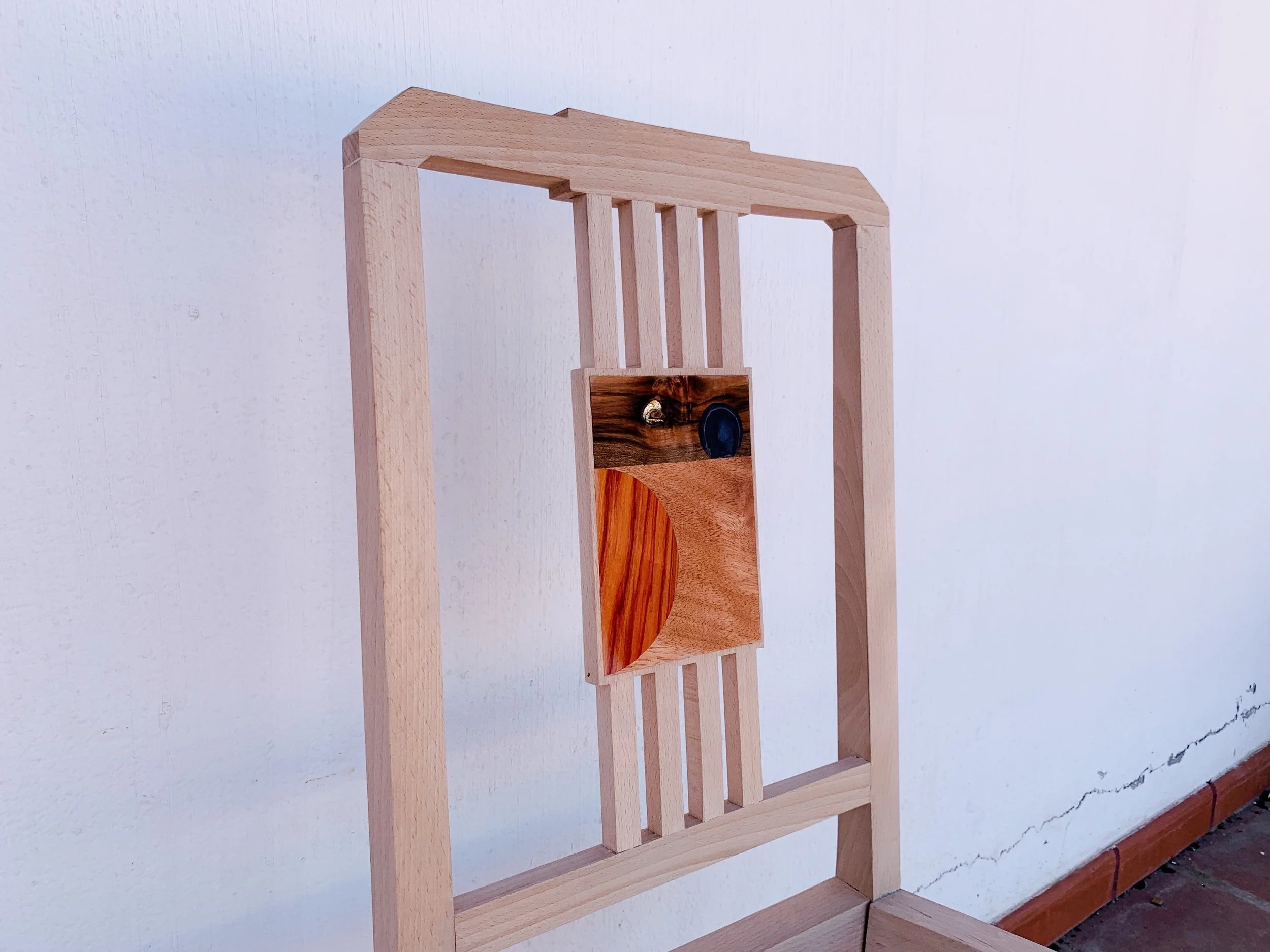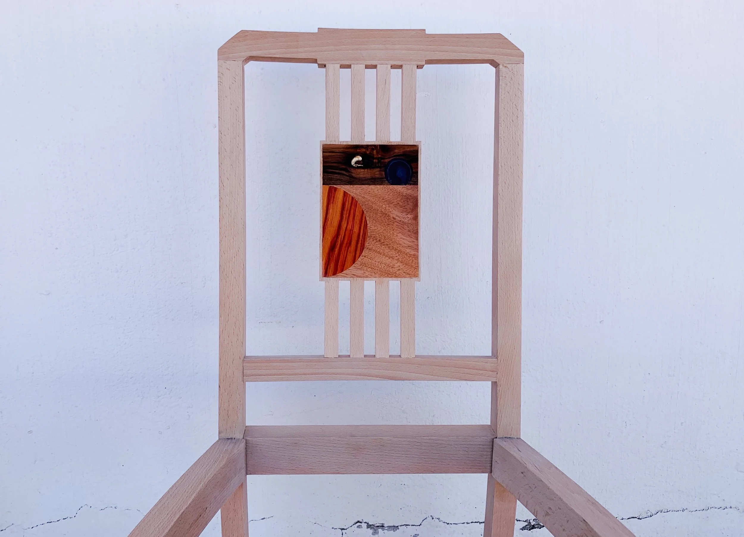 Chair with a cosmic design made with marquetry. Gold leave is integrated in the hole of the nod.